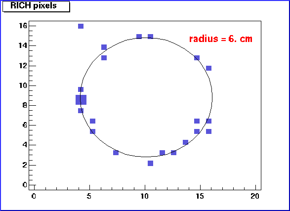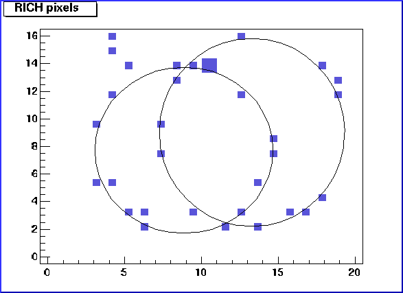 The run I picked has many events with rings in the RICH and they all look equally clean. The picture above has two rings. Once again, the circles are added "by hand".