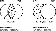 As illustrated above, the SQL IN predicate can be evaluated using a join to intersect two sets. Thus emp.deptno can be joined to dept.deptno to yield a list of employees in a set of departments.
