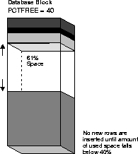 In this case, a data block used for this table's data segment is not considered for the insertion of any new rows until the amount of used space in the block falls to 39% or less (assuming that the block's used space has previously reached PCTFREE). Figure 10-2 illustrates this.