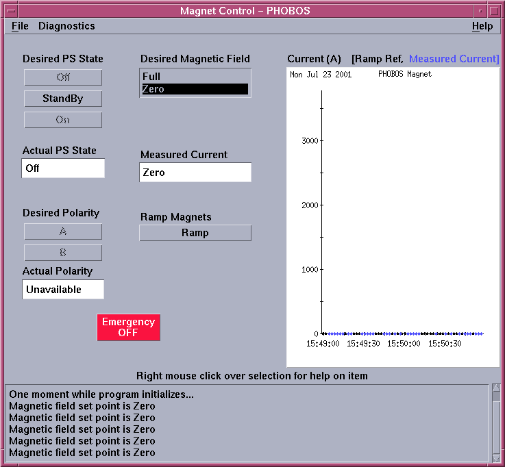You control the setting of the magnet from a special PHOBOS magnet control program (emc). This page is accessible from the RHIC X-terminal ('acnxtek79'). During normal running the 'Magnet' program should be running iconified except when needed. Double-click icon to open window. Please do not start duplicates! If it is not running, you can start the magnet program by clicking somewhere in the root window ('the background' in the X-terminal), holding the mouse button and selecting 'Magnet Control (emc)' page in the 'Phobos Controls Console' drop-down menu. You will be asked for a password, which is listed with other PHOBOS passwords. You should see something similar to the following picture: