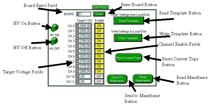1. Locate the HV On and HV Off Buttons in the Controls frame.